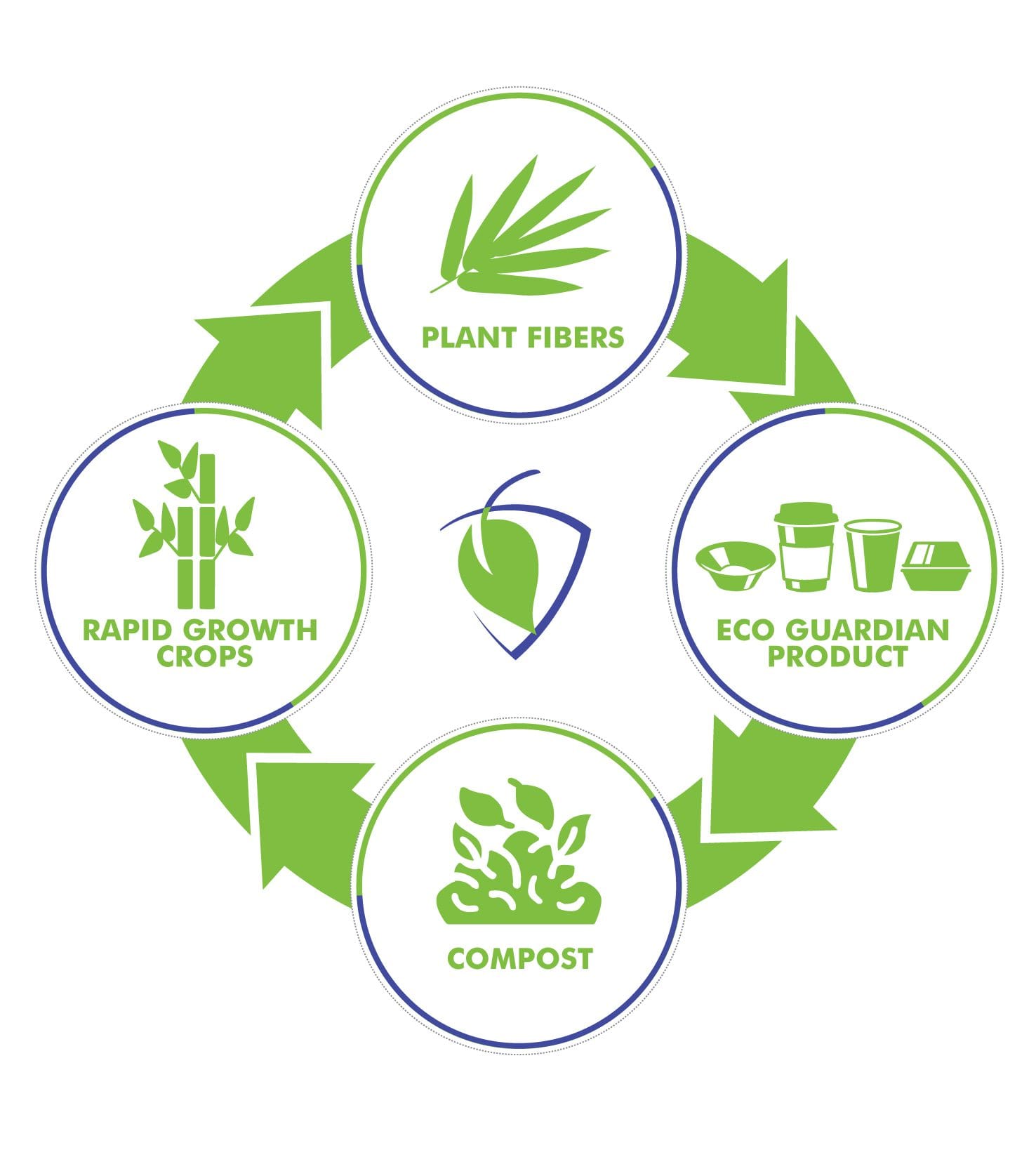 When the industry was certain that there was no suitable alternative for traditional plastic food packaging, we sought out manufacturers who aligned with our goals to reduce waste and used rapid-growth resources to alleviate the impact on the environment. The majority of products offered by Eco Guardian are re-purposed from natural compostable by-products produced by the manufacturing process of other products. In our case, most of the products are constructed from post-industrial sugar cane and bamboo, which reduces waste from our partners facility and supports the global circular economy.