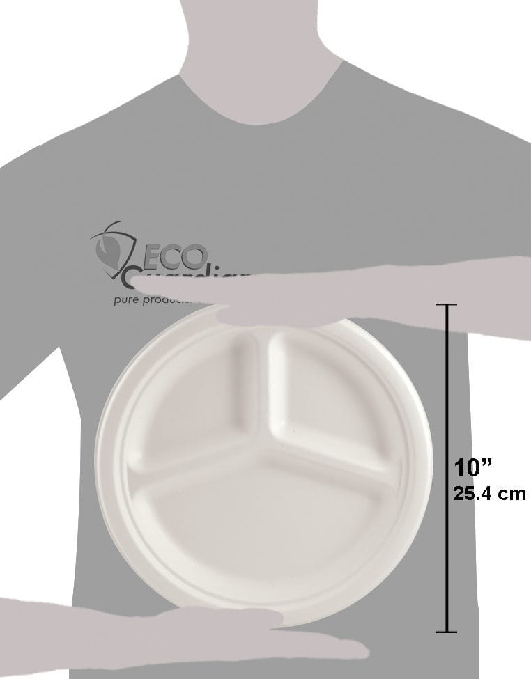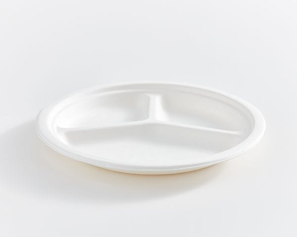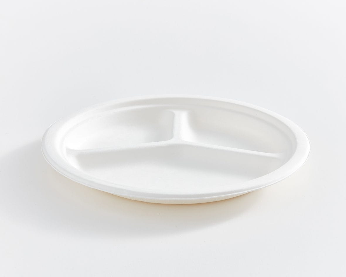 10″ Round Fibre Compostable 3 Compartment Plate. Premium strong and superior quality. Perfect for breakfast, lunch or dinner.