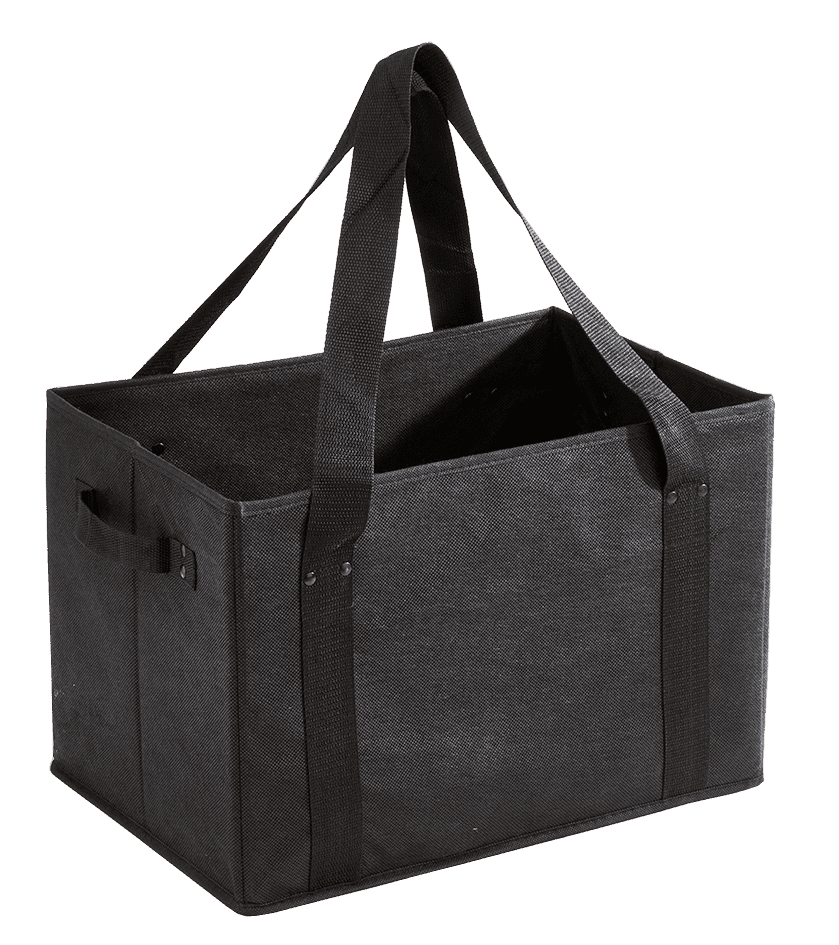 17″ x 11″ x 10.5″ Foldable Black Box Bag with Handles. Perfect size for groceries, take out, personal items, and a wide variety of uses. Box has rigid walls and base and is foldable for easy storage.