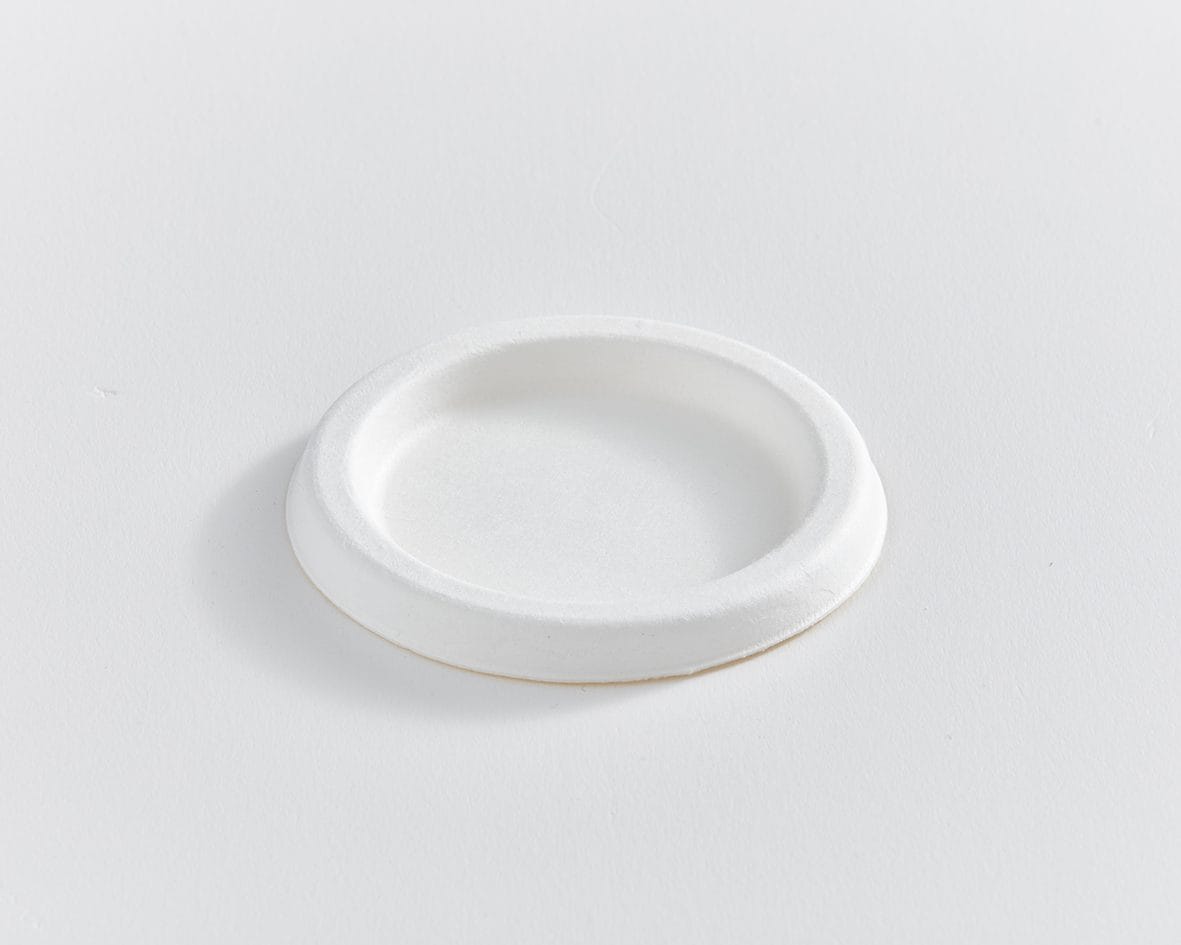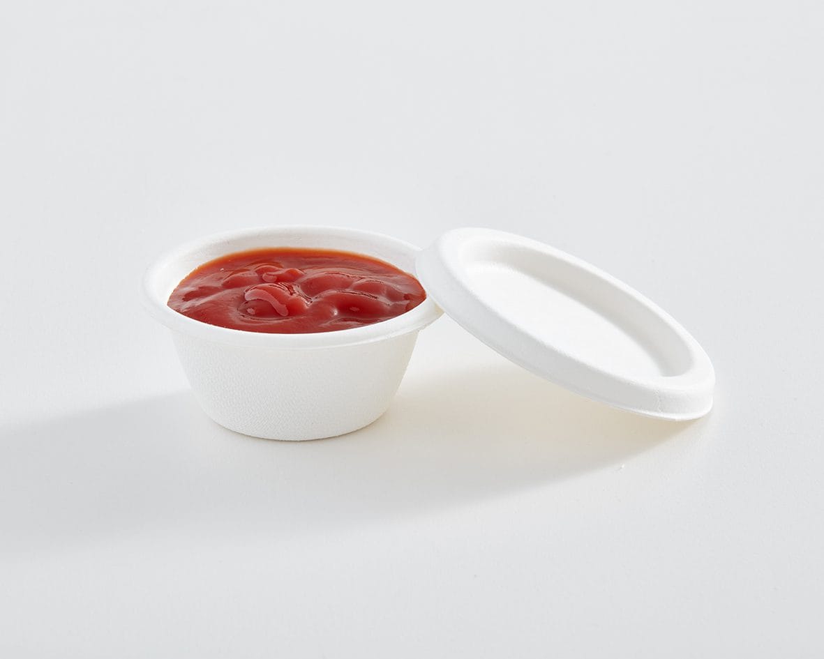 2 oz Compostable Bagasse Portion Cup Lid. Perfect size for cold beverages, iced tea, soda, juice, slushies, fruit cup, yogurt and smaller portions. Premium strong and sturdy quality, superior feel.